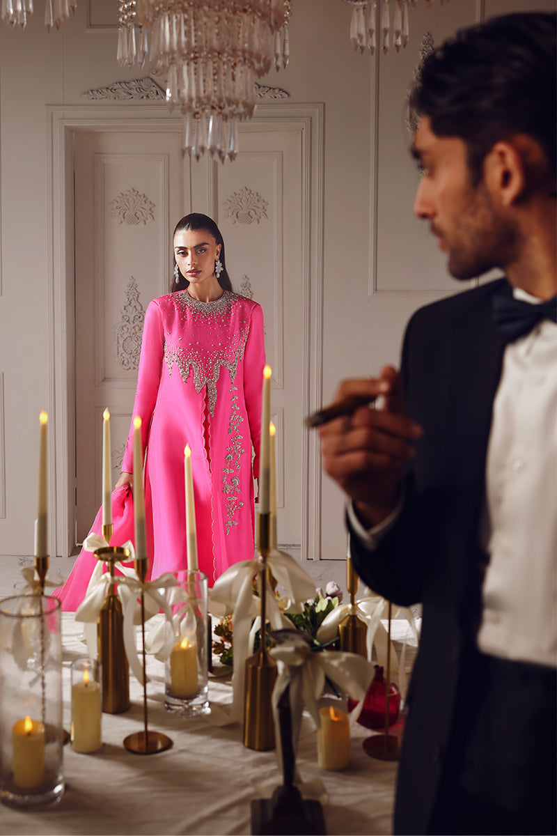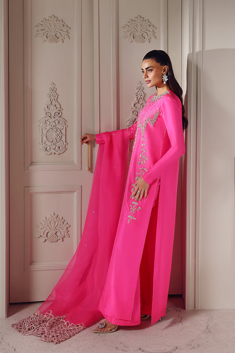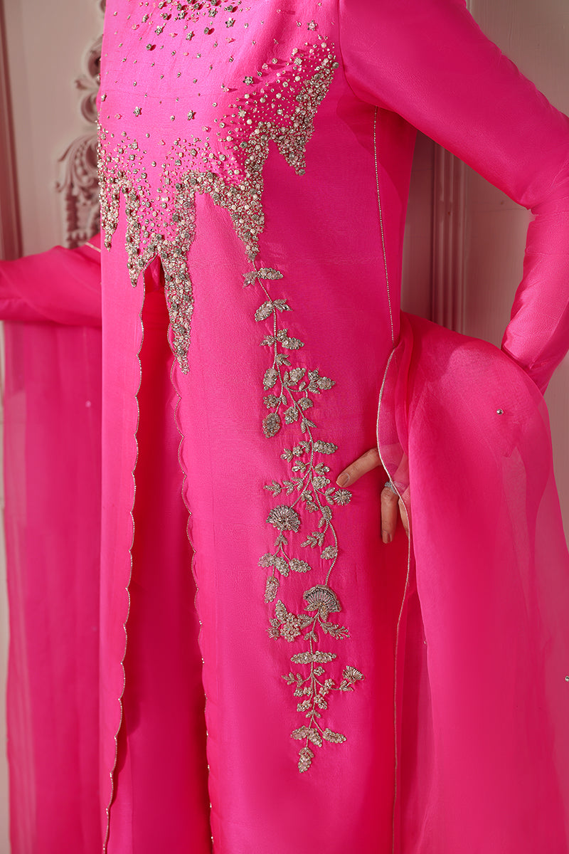 A striking neon pink ensemble featuring a long, front-slit shirt with an abstract, contemporary cut line that adds fluid movement and modern appeal. The neckline and shirt edges are adorned with delicate, one-of-a-kind hand embellishments, creating a refined yet artistic statement. Paired with elegant bootcut flared pants, the look is completed with a long pure organza dupatta, finished with modern cutwork edges for a light, ethereal touch. This outfit perfectly balances bold color with intricate craftsmanship and modern design.