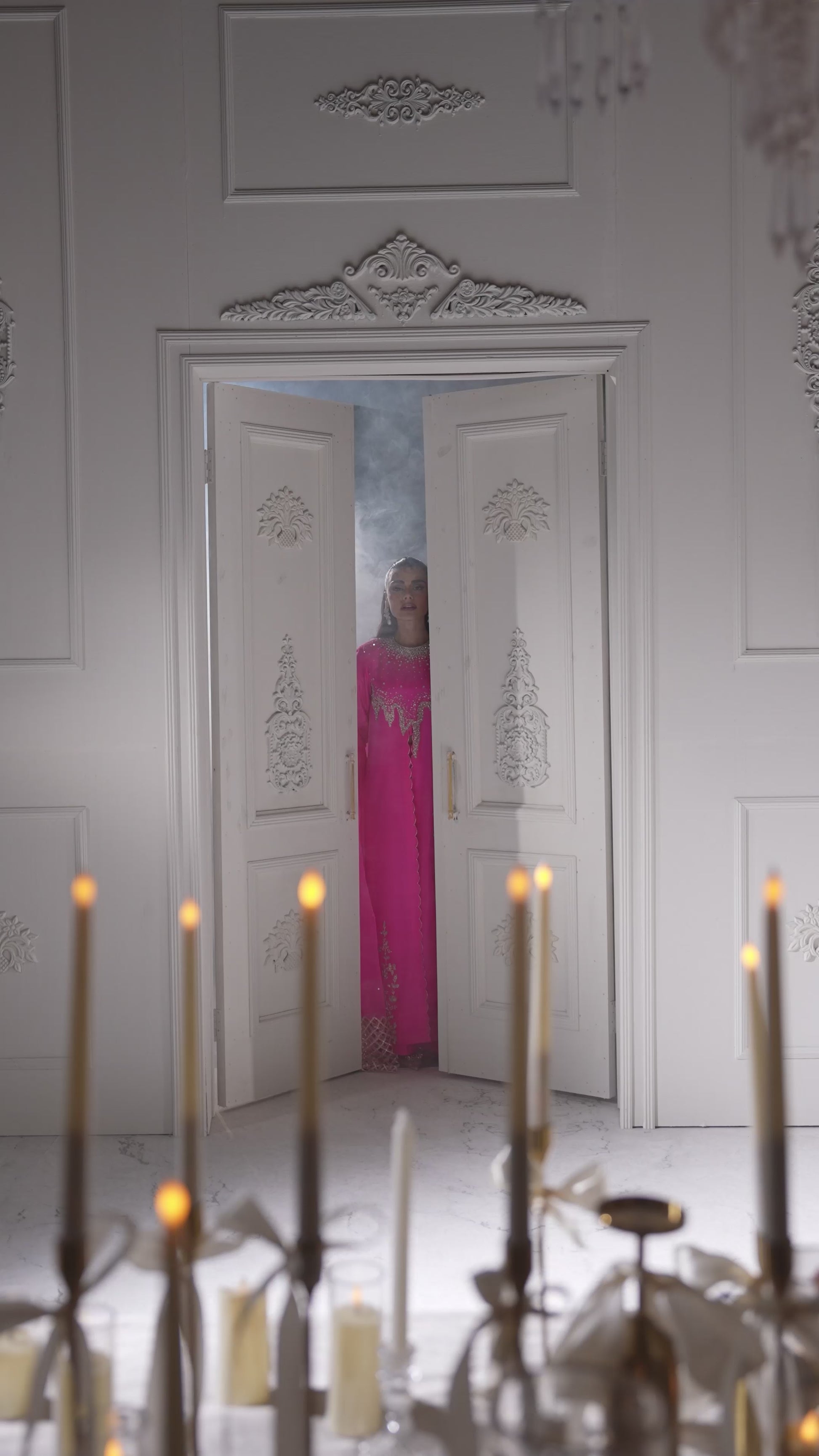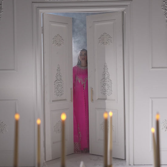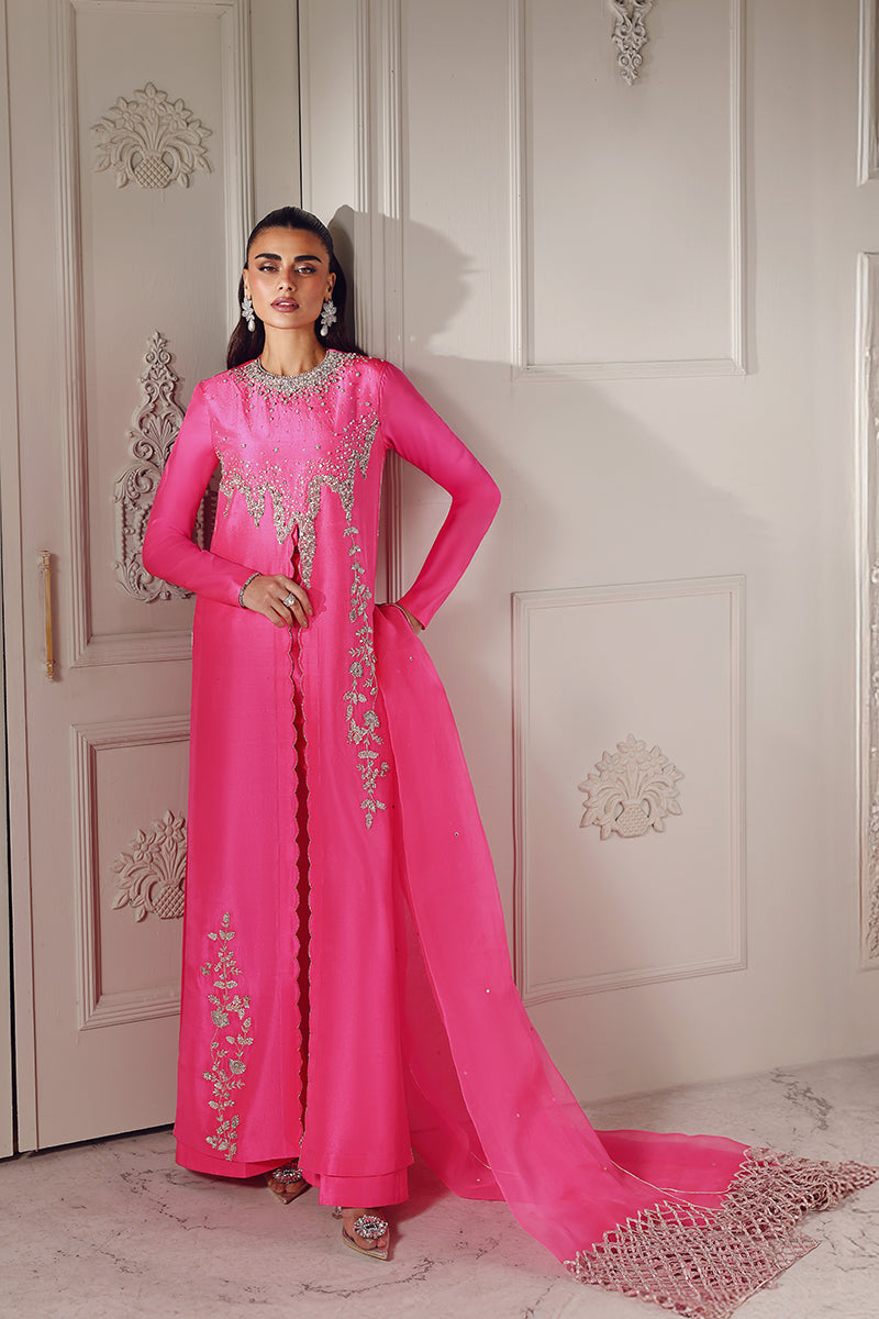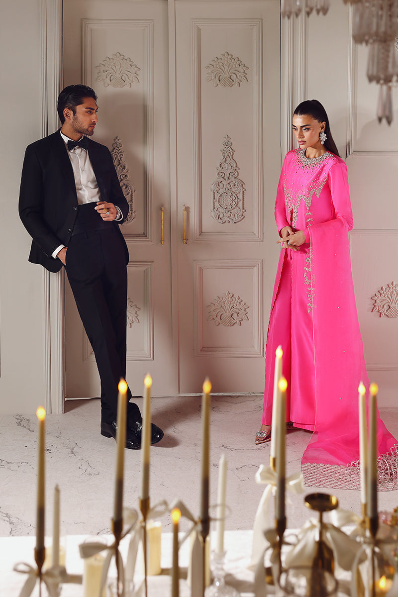 A striking neon pink ensemble featuring a long, front-slit shirt with an abstract, contemporary cut line that adds fluid movement and modern appeal. The neckline and shirt edges are adorned with delicate, one-of-a-kind hand embellishments, creating a refined yet artistic statement. Paired with elegant bootcut flared pants, the look is completed with a long pure organza dupatta, finished with modern cutwork edges for a light, ethereal touch. This outfit perfectly balances bold color with intricate craftsmanship and modern design.
