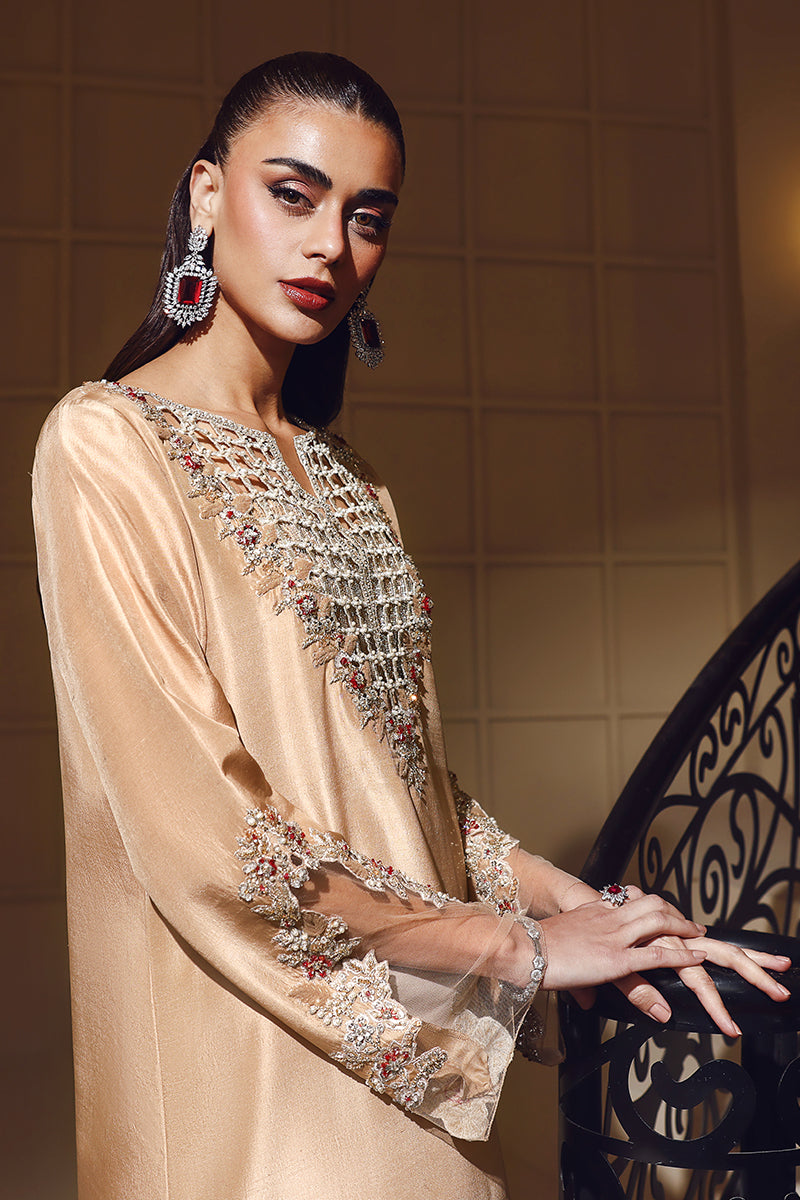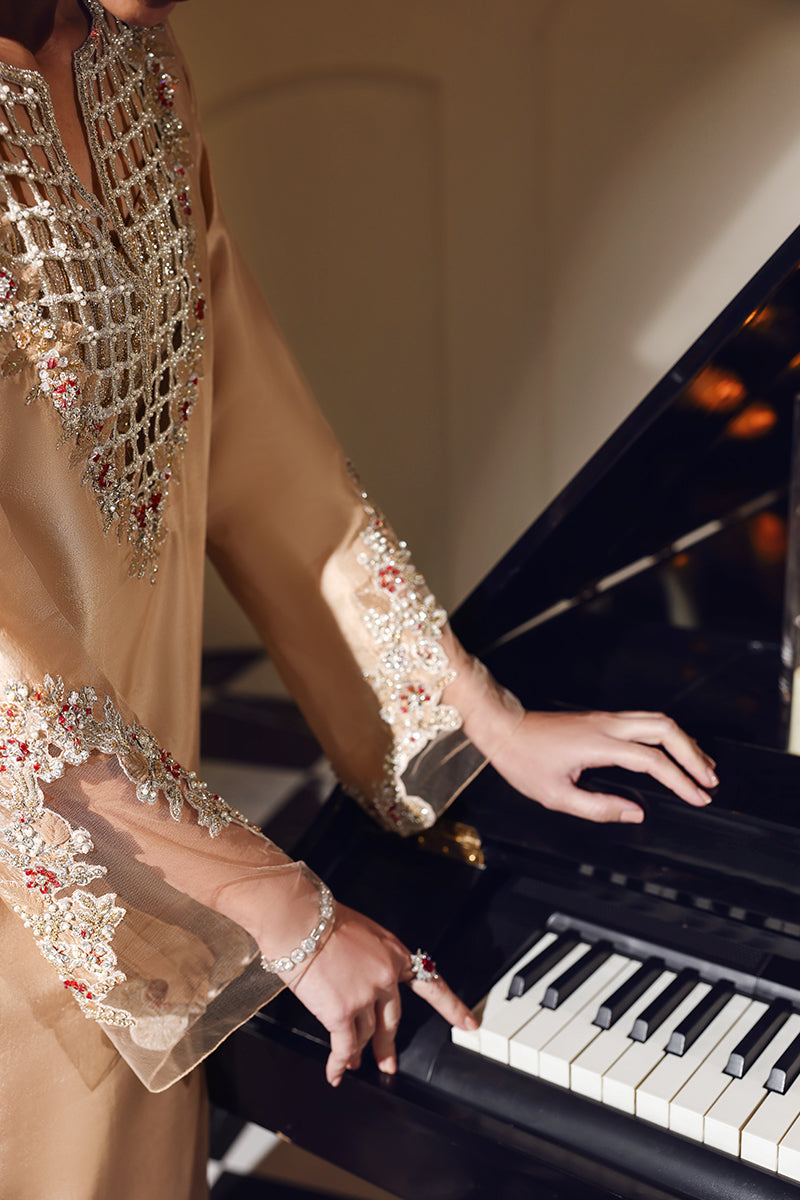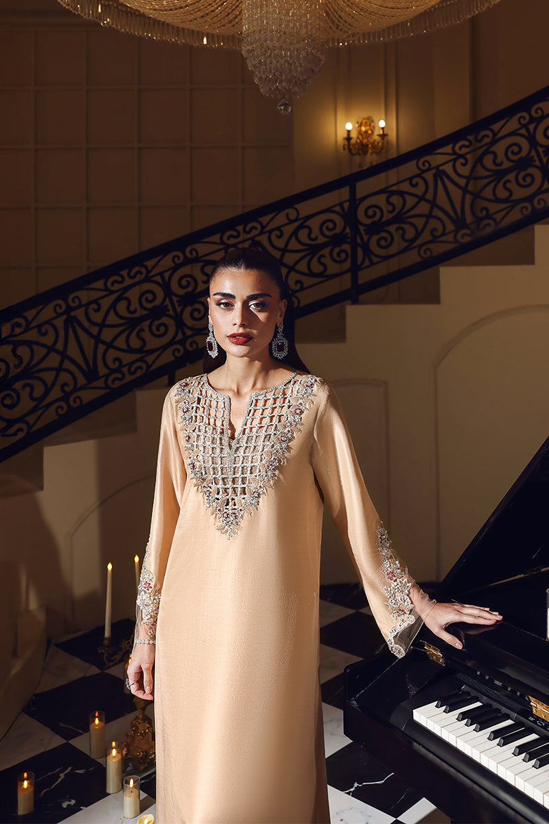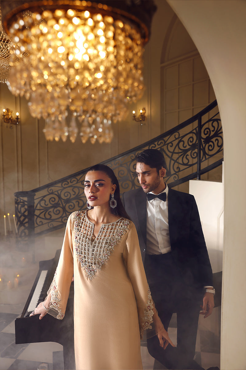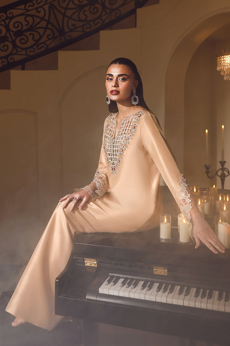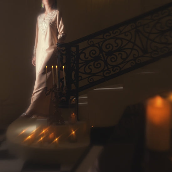 Champagne Chèrie is a luxurious long kaftan that exudes modern elegance and bold sophistication. Designed with an exquisitely intricate cutwork neckline, the kaftan features beautifully crafted hand embellishment that highlights fine artisanal detail and contemporary artistry. The lower hem is enhanced with matching cutwork, adding depth and visual interest to the silhouette. Beneath, a unique, bling-infused hot bustier subtly reveals itself through the neckline cutwork, lending a refined yet striking edge to the look. Effortlessly glamorous and statement-driven, Champagne Chèrie is a perfect blend of modern design, craftsmanship, and elevated fashion.