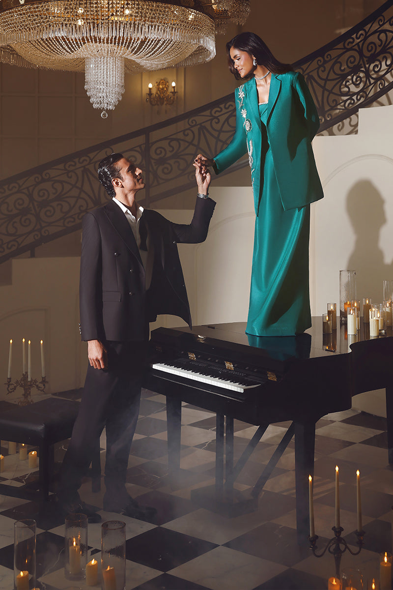 Emerald Heiress showcases a sleek sleeveless gown with a dramatic side slit, layered with a tailored statement jacket that adds structure and sophistication. The jacket is adorned with hand-embellishments, creating a striking play of shimmer and texture that elevates the entire look.The embellishment placement enhances the silhouette, catching light with every movement and giving the outfit a luxurious, couture finish. Together, the fluid gown and structured jacket create a powerful contrast modern, elegant, and effortlessly glamorous making this ensemble ideal for high fashion evenings and statement occasions.