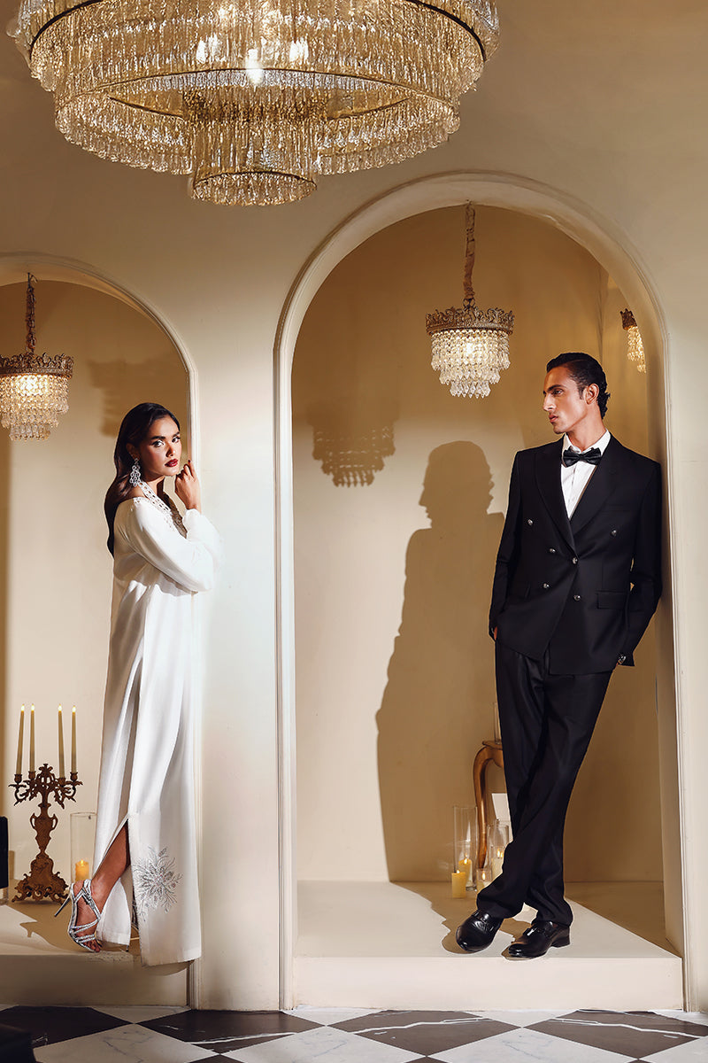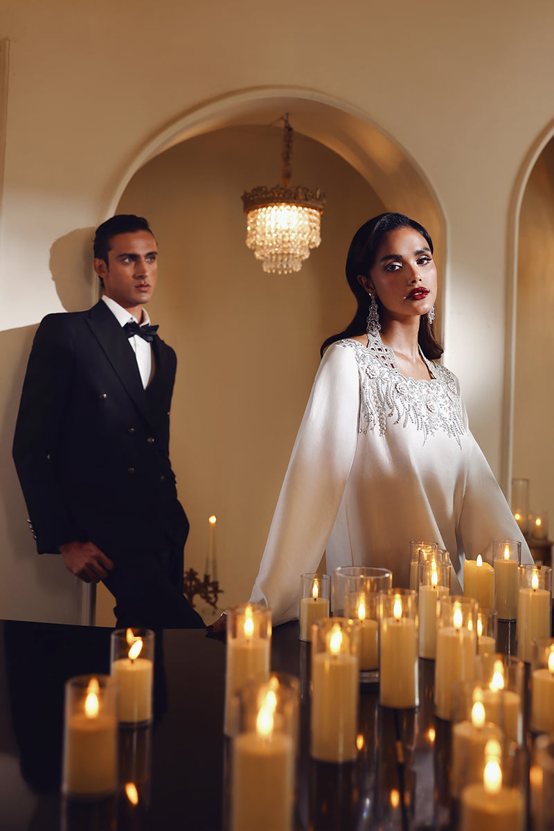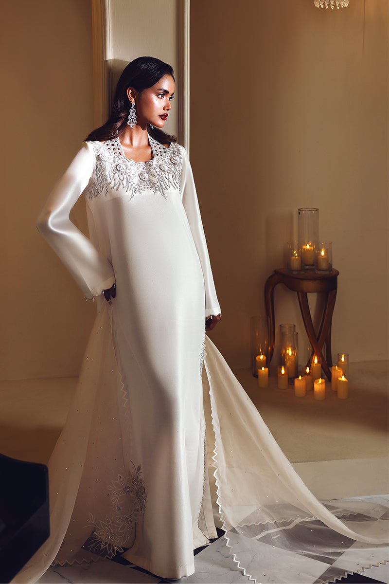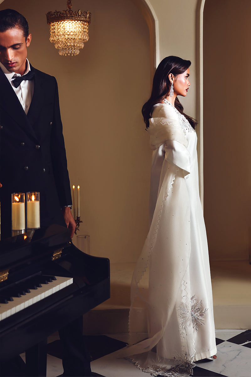 A magnetic white long shirt elevated with pastel embroidery and intricate, high-end embellishment that delivers a bold, modern sparkle visible from afar. The neckline features a chic halter-inspired design element, adding a contemporary edge to the classic silhouette. Paired with a white organza dupatta adorned with modern motifs and finished with distinctive triangular scalloped edges, this ensemble is unapologetically blingy, luxurious, and fashion-forward; an unmistakable statement of high-end elegance.