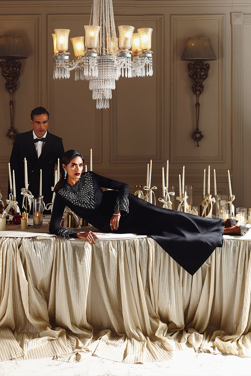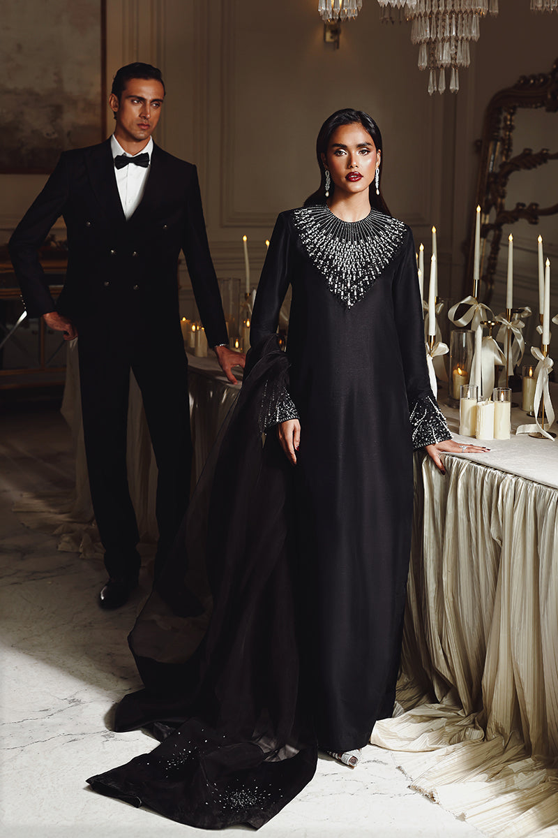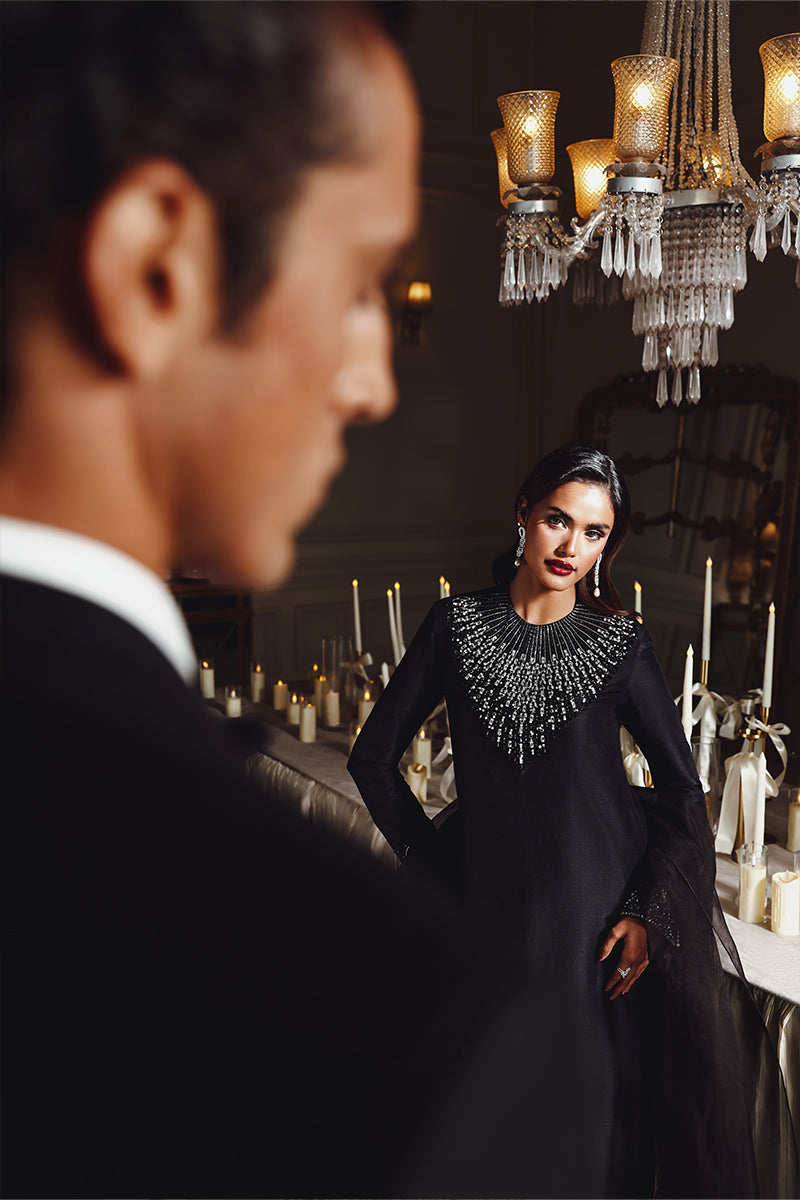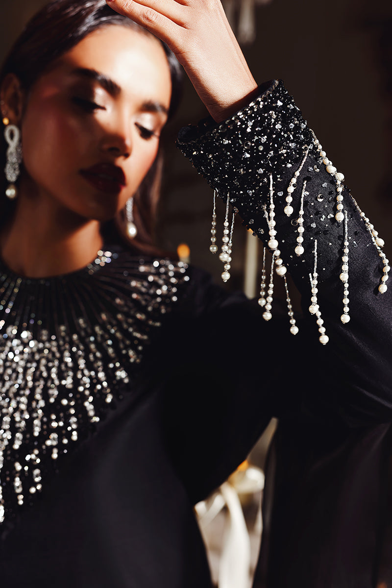 Midnight Muse features a black long shirt with sleek, tailored pants, defined by a sharp and modern cutline with structured cuffs. The outfit is elevated with delicate pearl and Swarovski embellishments, adding refined sparkle against the dark base.Tasseled sleeve cuffs bring subtle movement and character, while the statement dupatta adds drama and confidence, giving the ensemble true main character energy. The overall look is elegant, modern, and effortlessly powerful.
