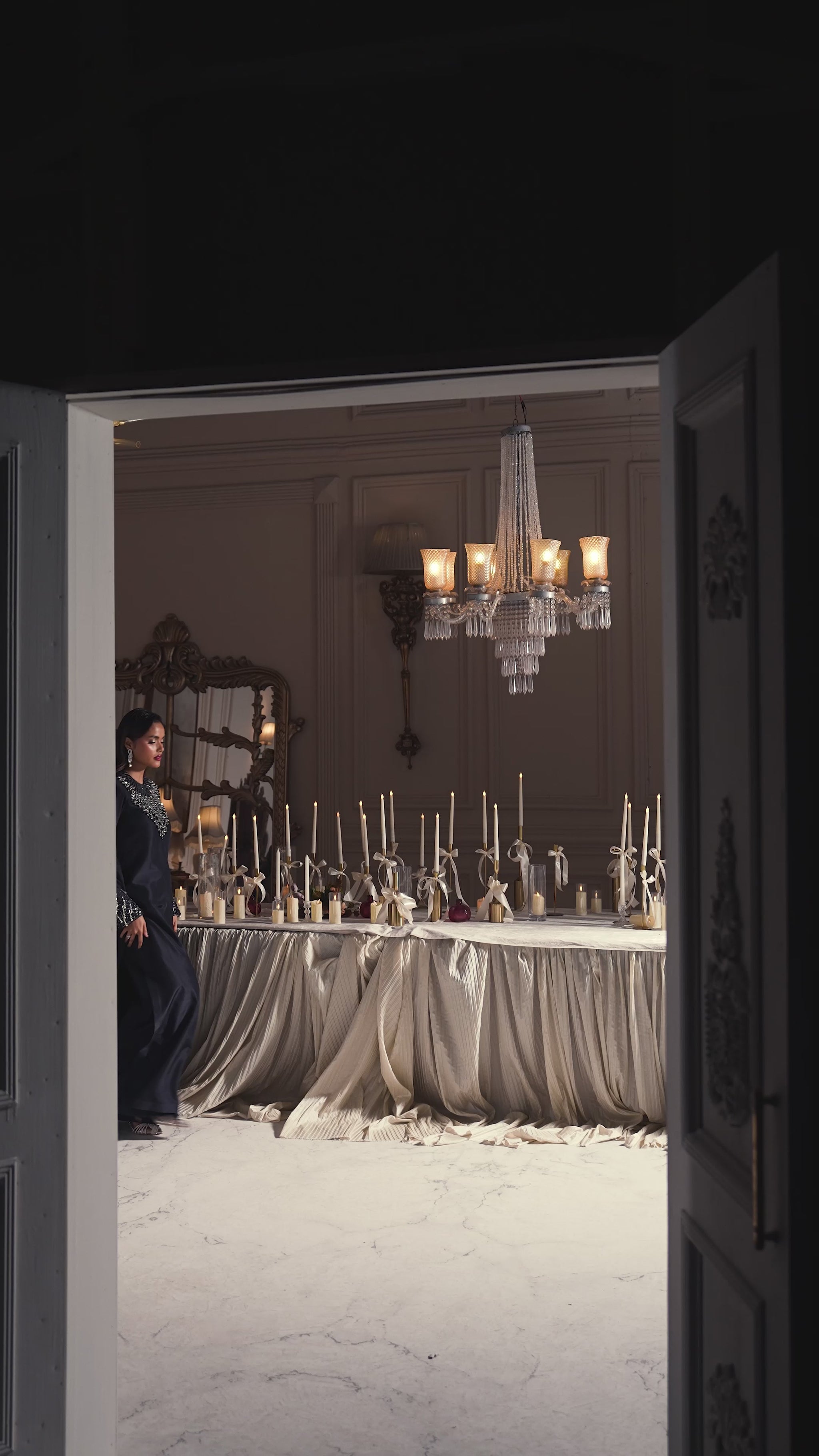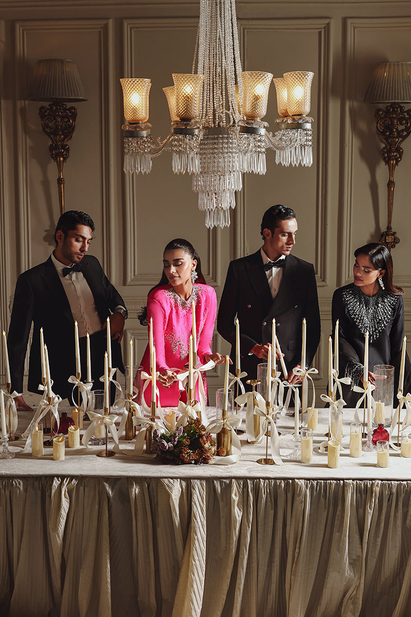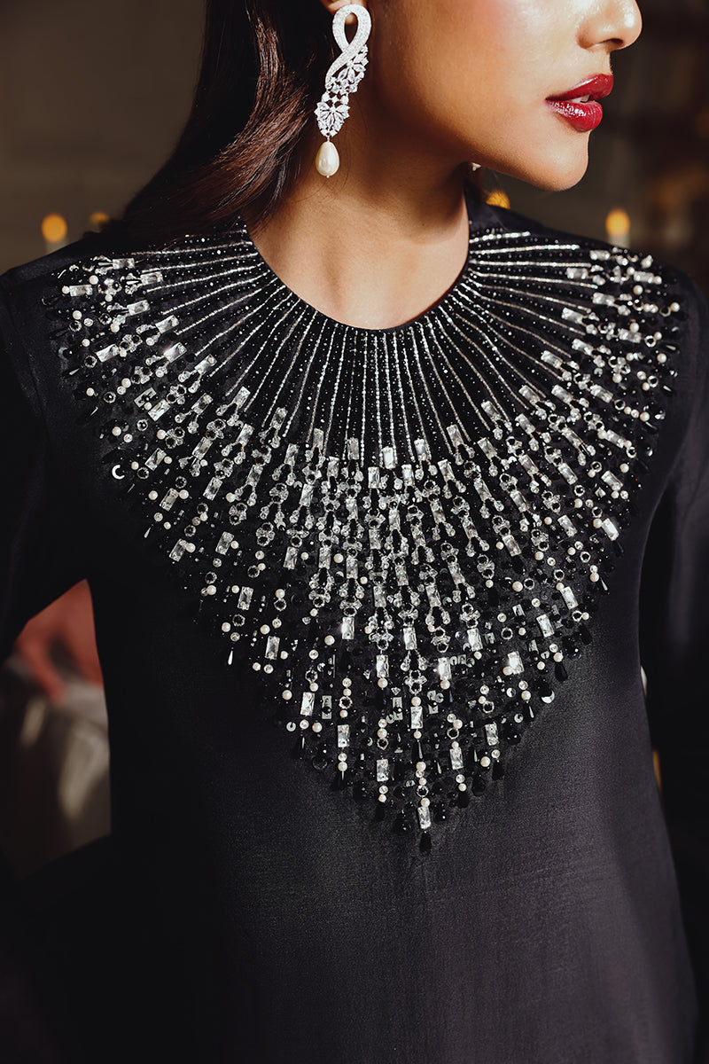 Midnight Muse features a black long shirt with sleek, tailored pants, defined by a sharp and modern cutline with structured cuffs. The outfit is elevated with delicate pearl and Swarovski embellishments, adding refined sparkle against the dark base.Tasseled sleeve cuffs bring subtle movement and character, while the statement dupatta adds drama and confidence, giving the ensemble true main character energy. The overall look is elegant, modern, and effortlessly powerful.