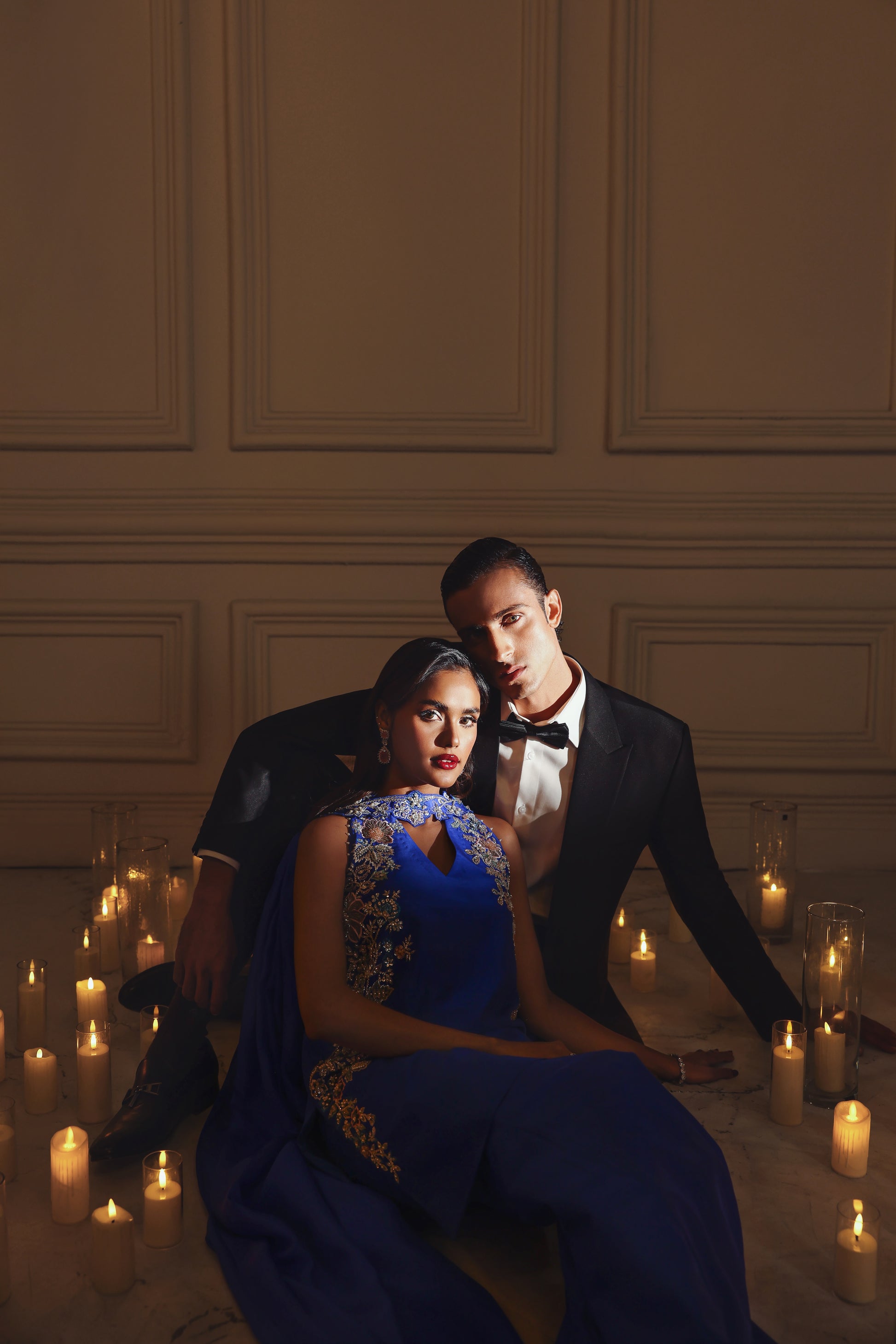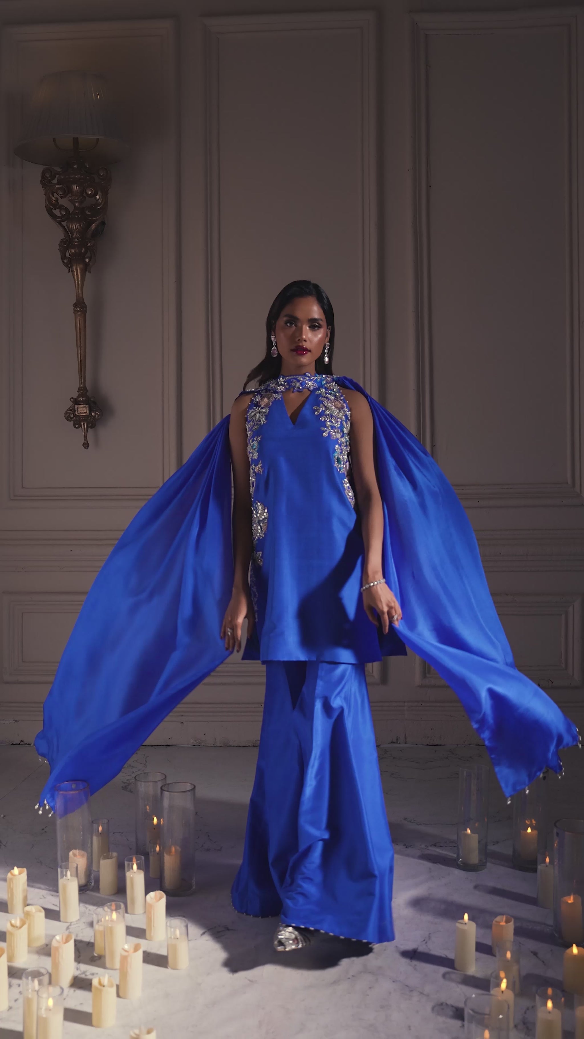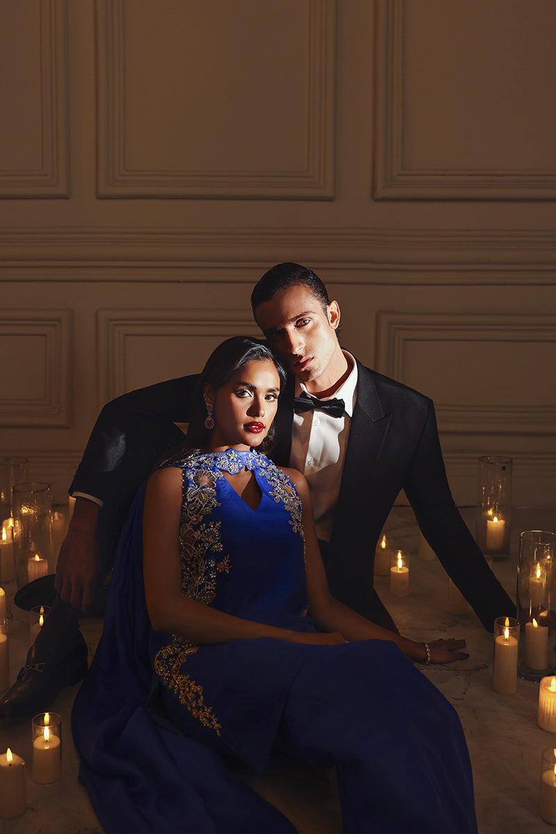 Sapphire Siren is a modern ethnic ensemble featuring an electric blue halter shirt paired with bellbottom pants and a skinny embellished dupatta. The silhouette is sleek, blending contemporary fashion with a touch of retro elegance. The highlight of the outfit is its floral applique and detailed embroidery, enhanced with luxurious hand embellishments using pearls, sequins, Swarovski crystals, and cut dana. These elements add texture, depth, and a refined shimmer, giving the outfit a rich, statement look. Overall, the design reflects a fusion of modern aesthetics and traditional craftsmanship, perfect for festive and evening wear.
